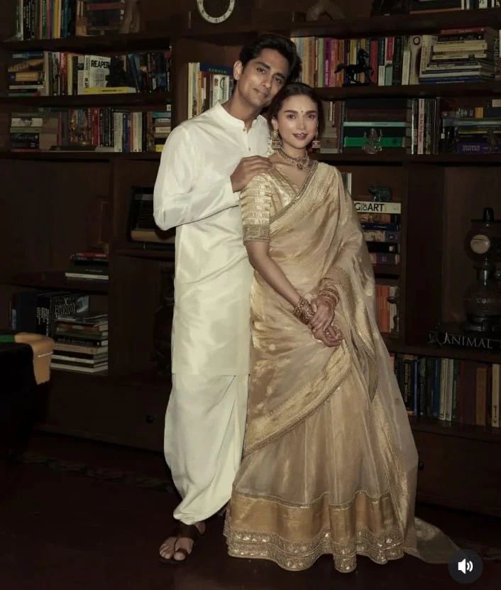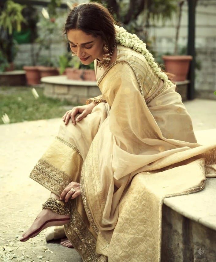 This bridal Gold Soft Banarasi Glass Tissue Silk saree, inspired by Aditi Rao's Wedding style, features a stunning traditional golden zari with all over lace border design.