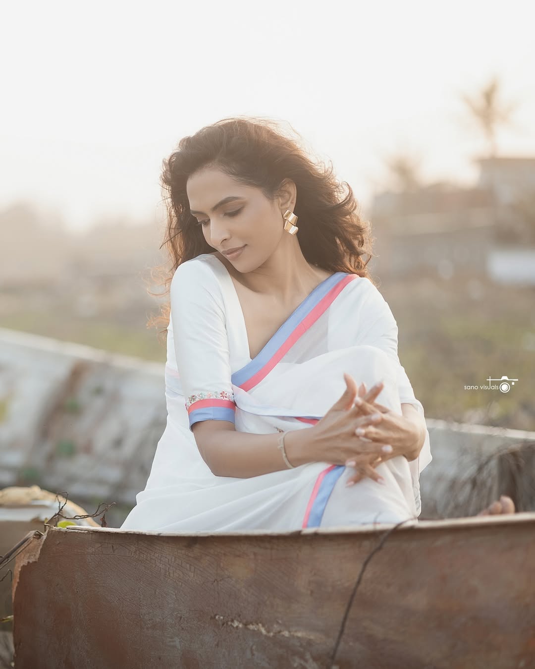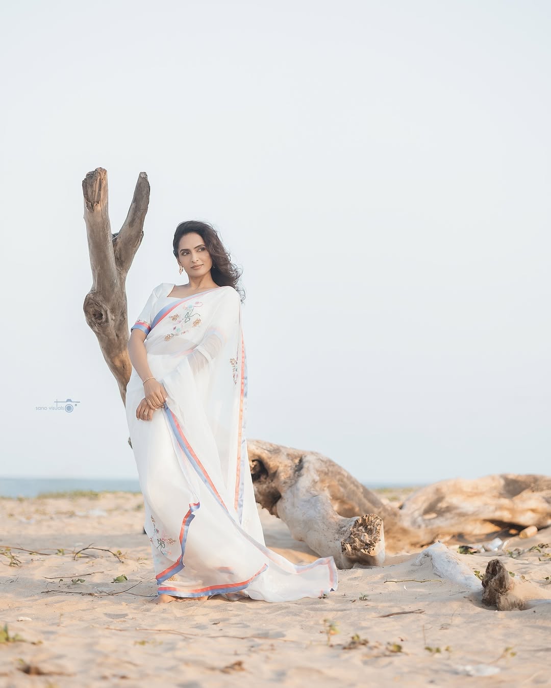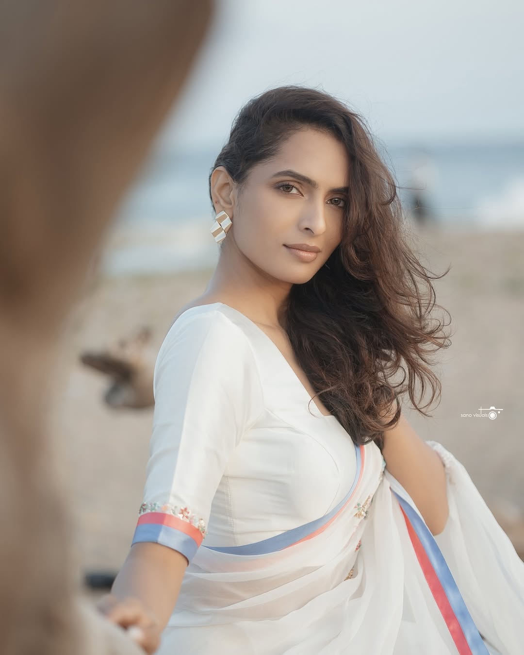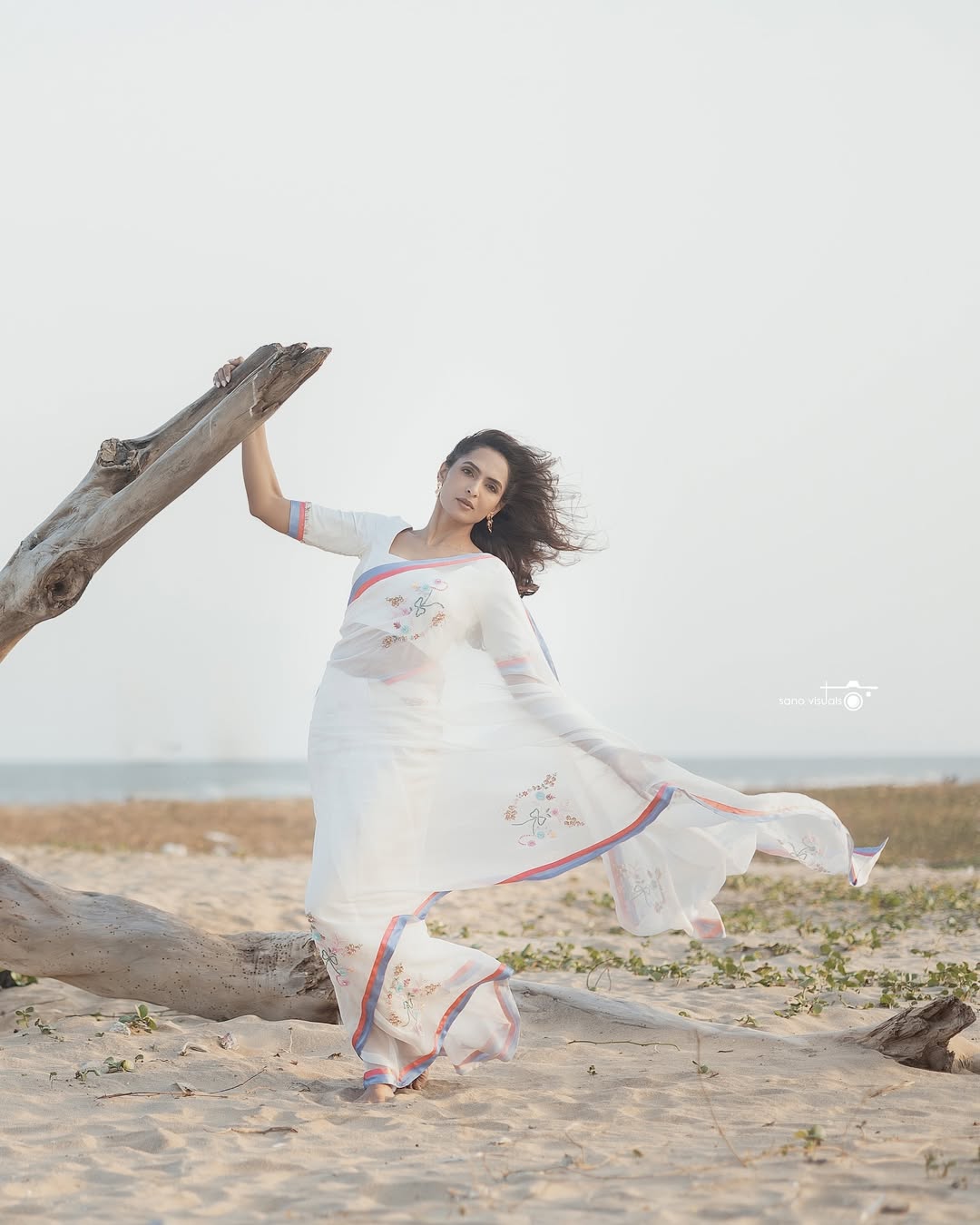 This exquisite ivory saree features delicate pastel floral prints, radiating elegance and sophistication. Its standout element is the meticulously crafted border, where layers of pastel pink and blue are precisely cut, affixed to a sturdy canvas, and seamlessly integrated into the saree. This intricate detailing not only elevates its aesthetic charm but also lends a distinctive structure to its drape and flow.