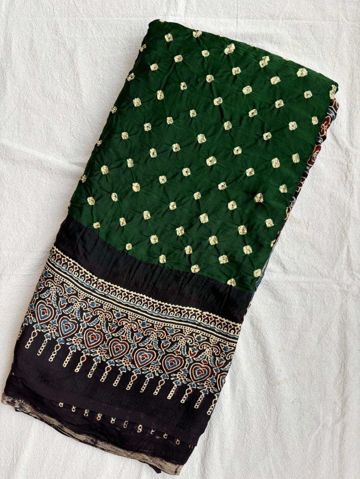 The Ajrakh hand block printed saree showcases a starry sky, adorned with natural dyes. The harmonious blend of mehndi green, indigo, and beige creates a stunning visual effect. Crafted from Modal Dola silk, this saree transforms under varying light conditions, revealing its enchanting beauty.