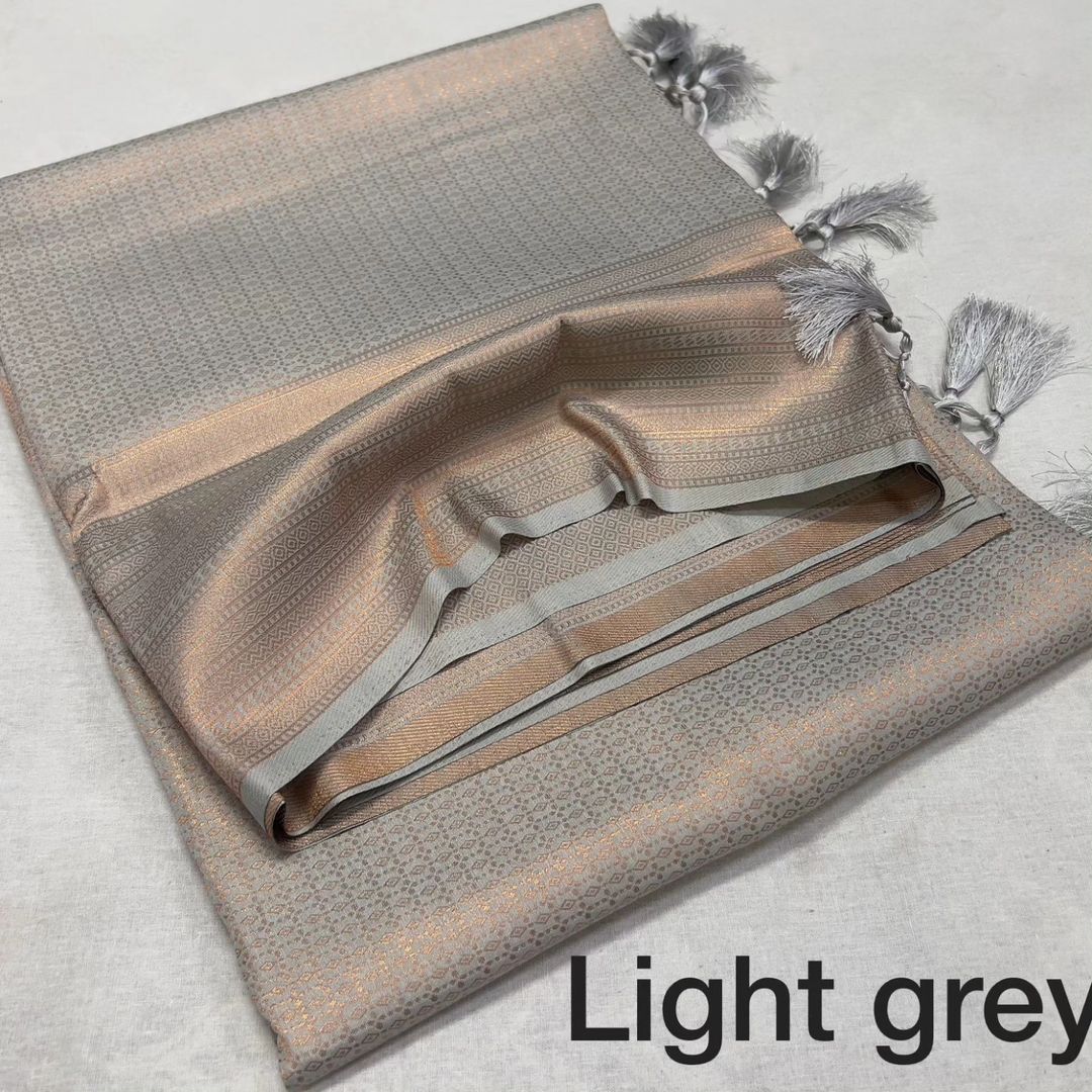 richness and pureness of light grey soft silk saree