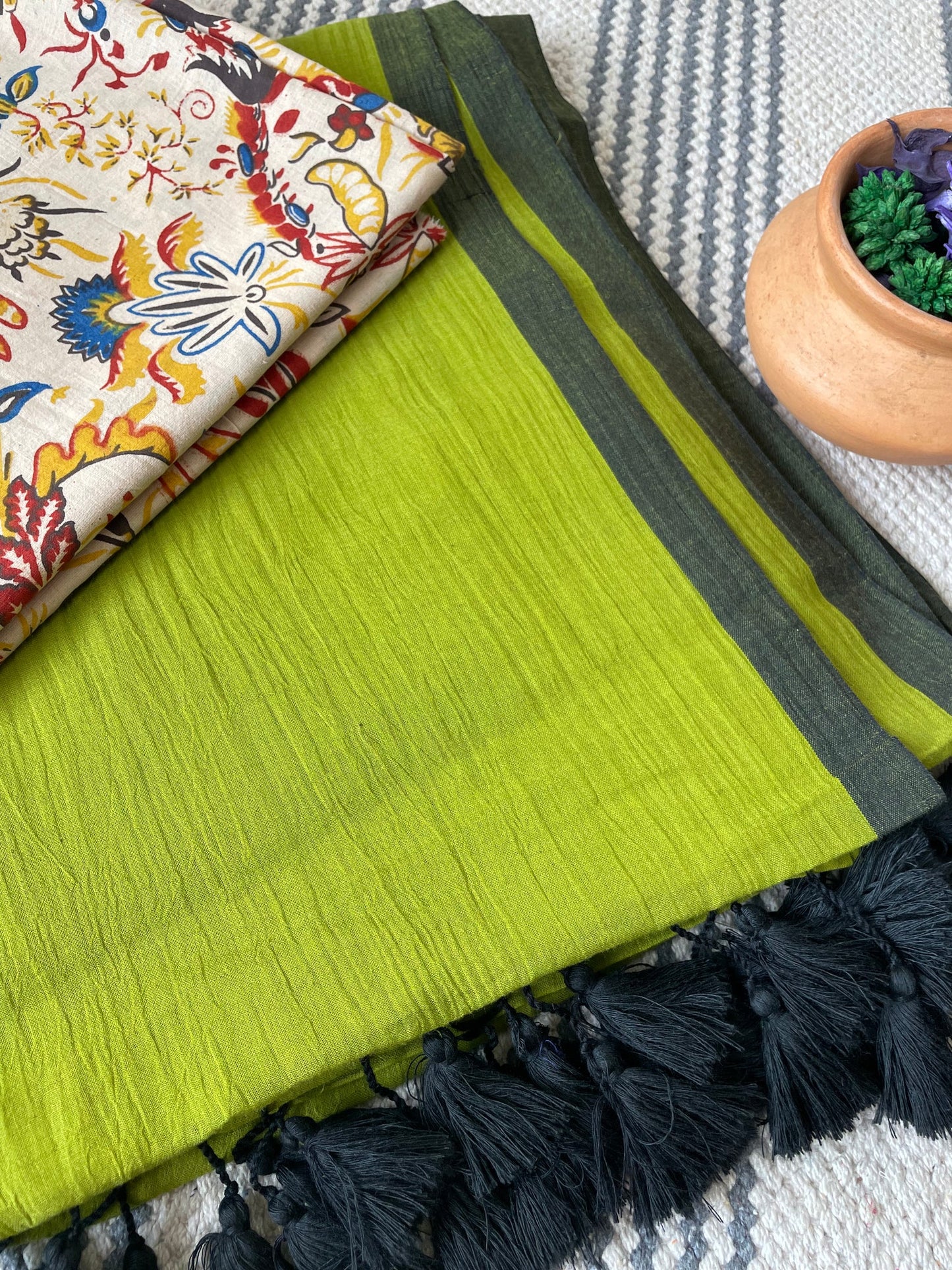 It has got plain with tassels crafted pallu and plain border.