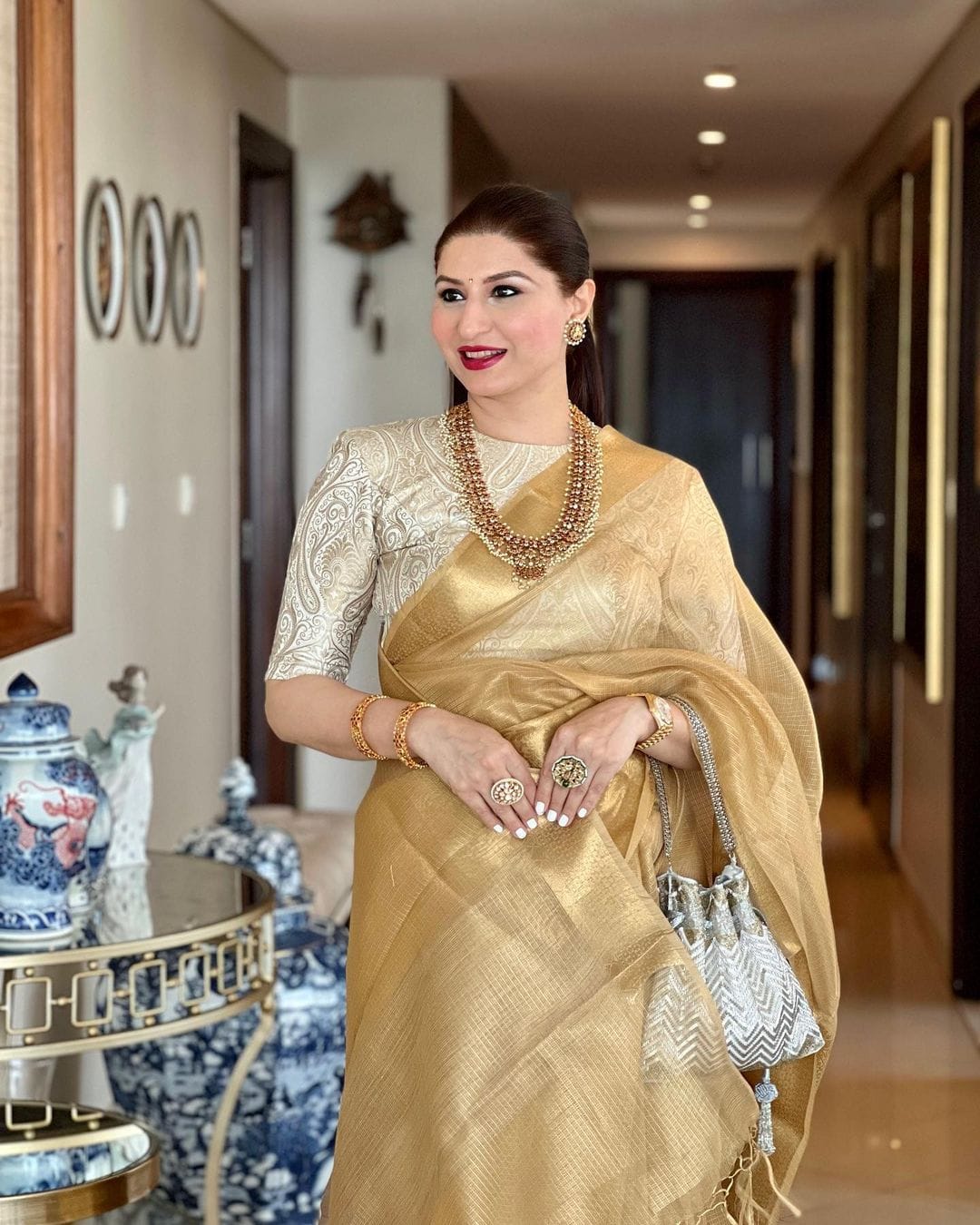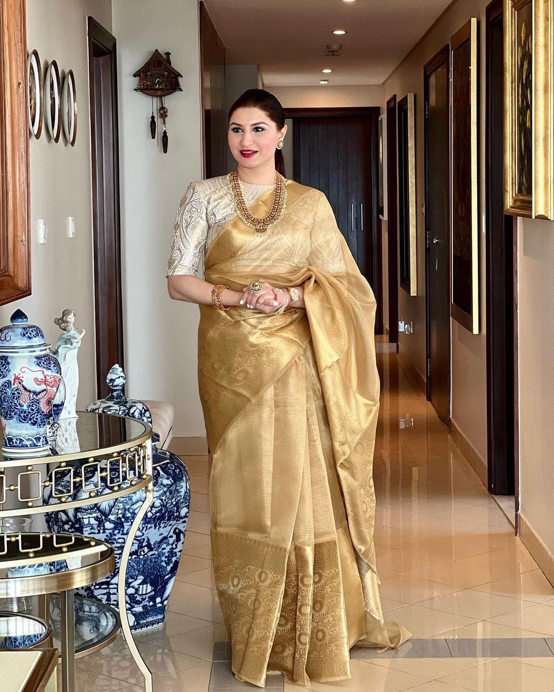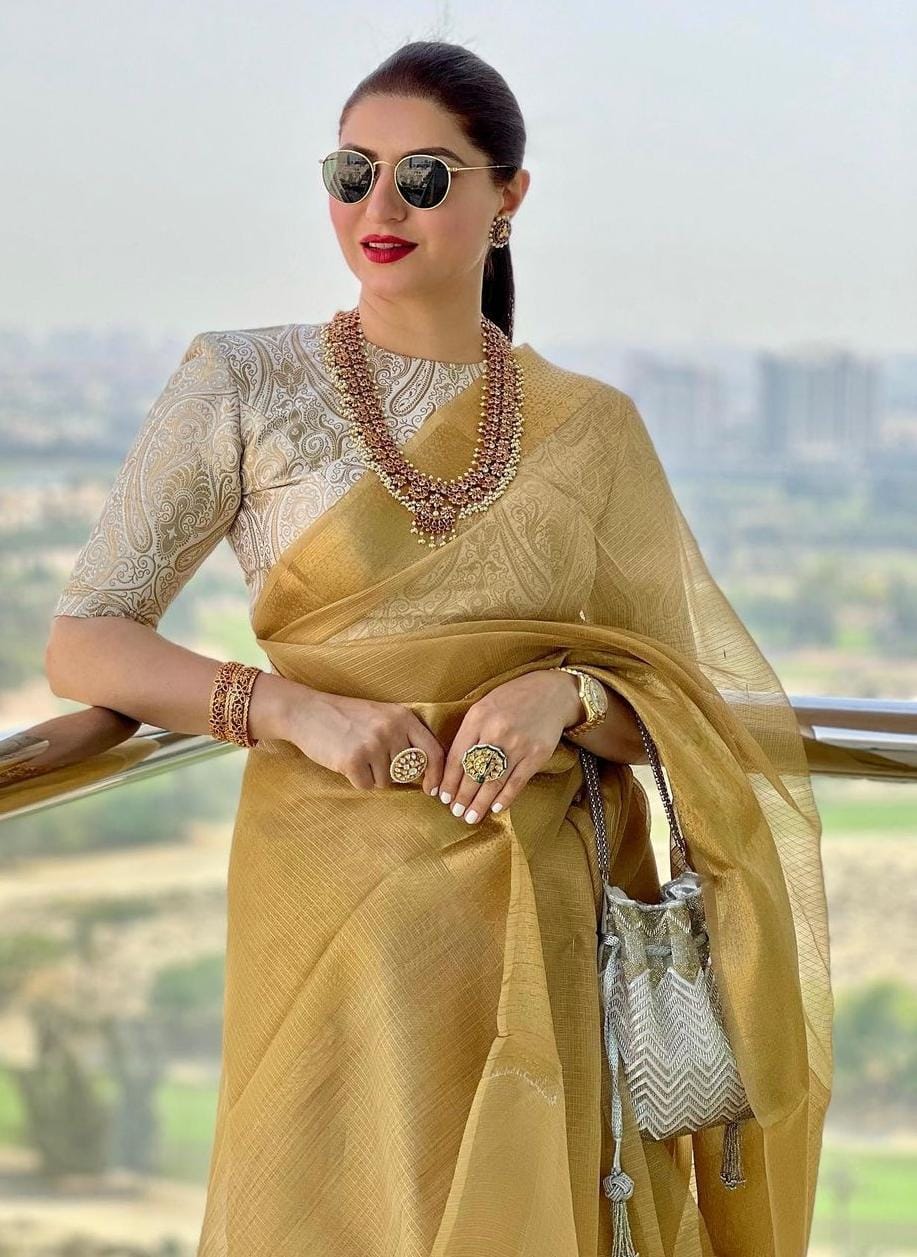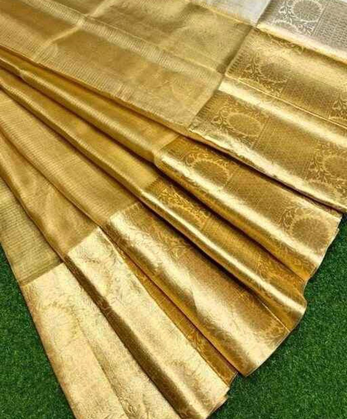 Note: A tissue saree is one of the most gossamer forms of saree and is known for its sheen, richness, and luxurious feel. This lustrous fabric is perfect for formal and casual occasions and is the easiest way to achieve a classy look.