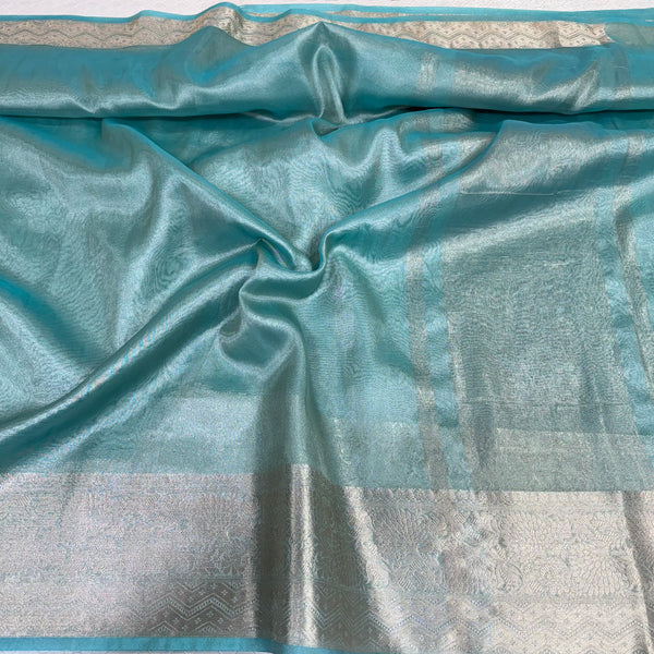 Most Awaited Janhvi Kapoor inspired soft tissue silk saree in Golden zari floral Jacquard border in sea green Shade.