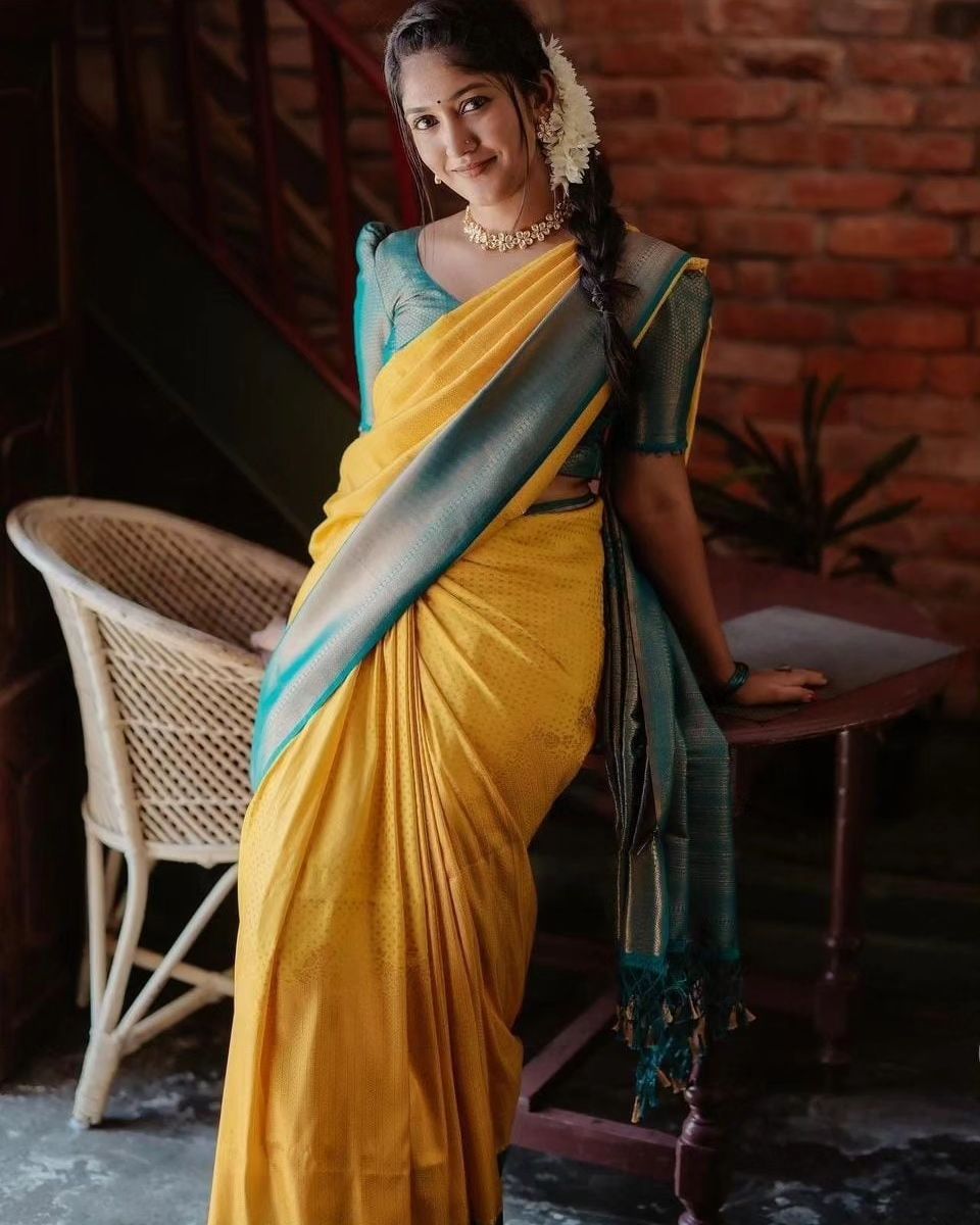 Lemon yellow and Turquoise Kubera Pattu Saree