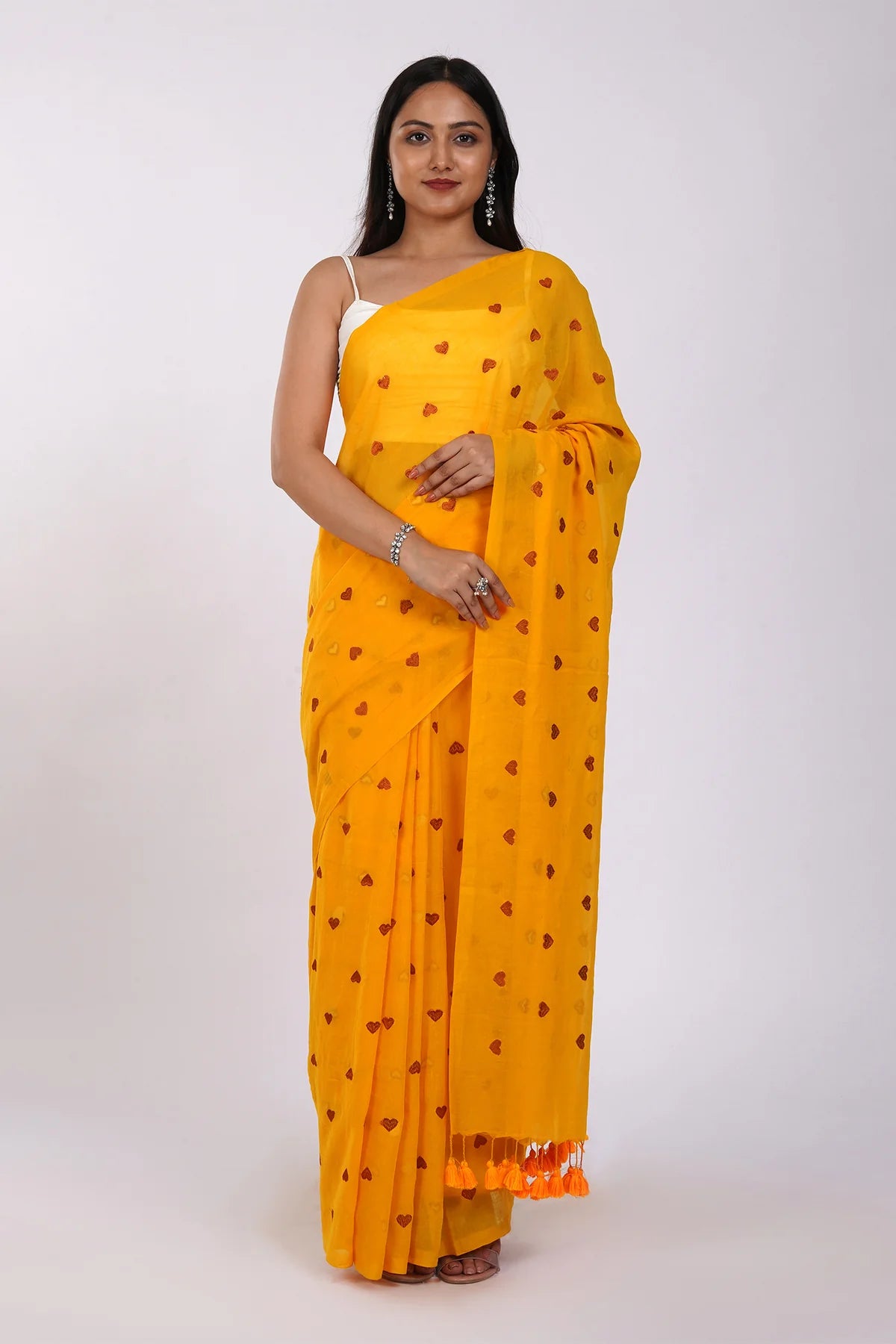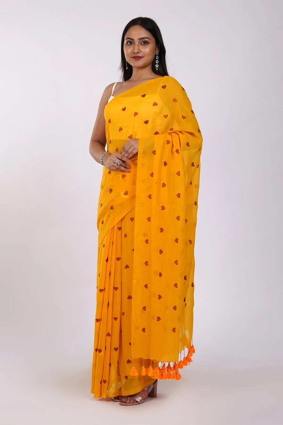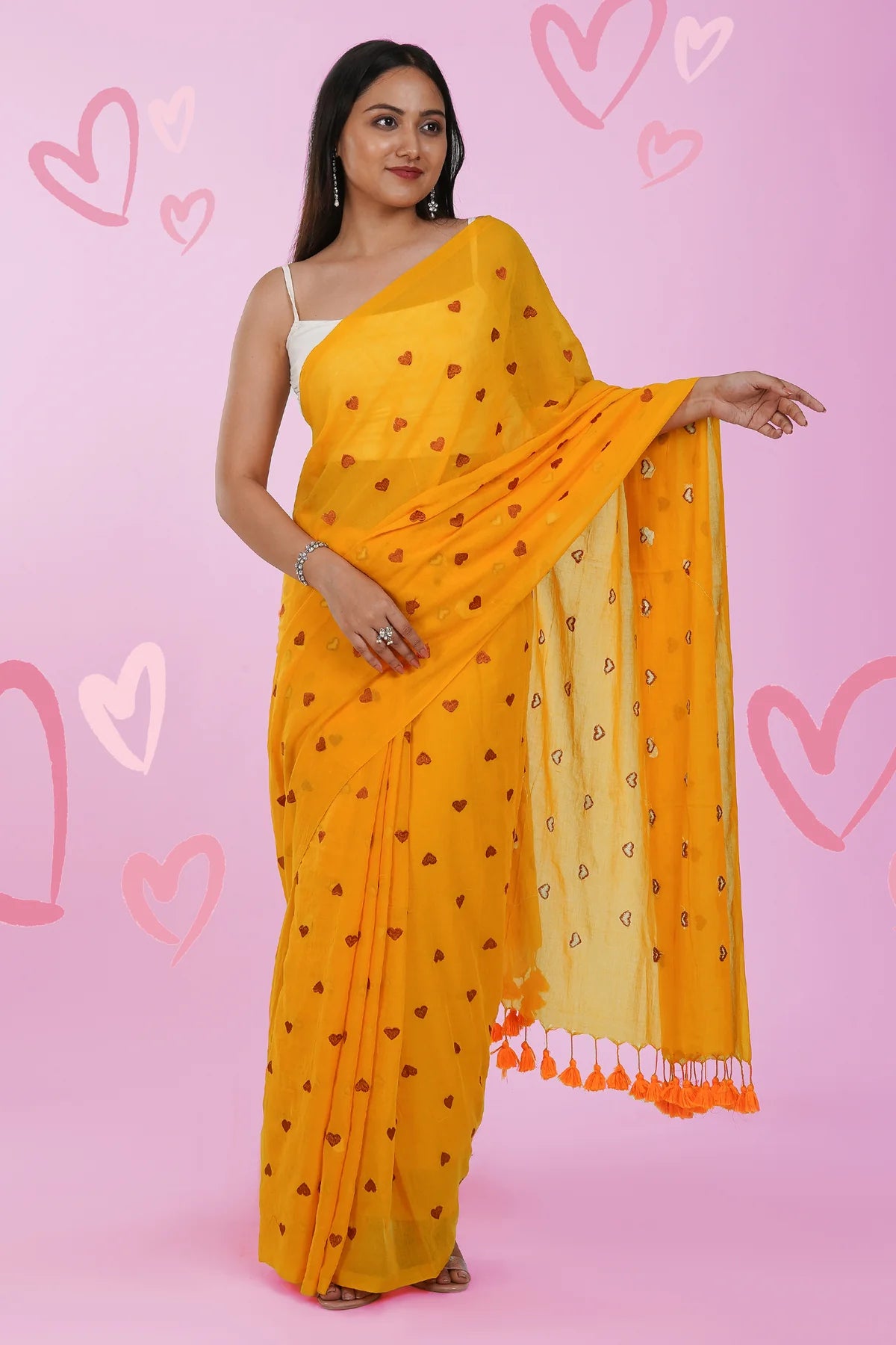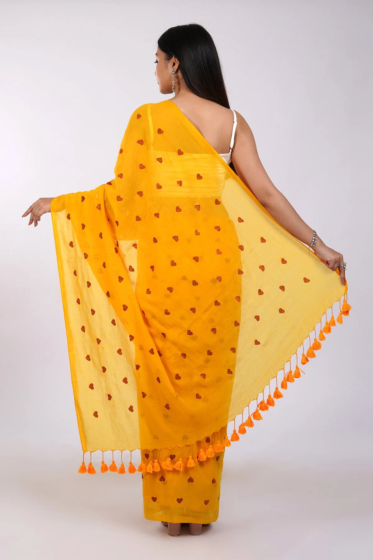 Pure cotton construction and Heart embroidery motifs give this sari an elegant and unique look, perfectly finished with tassels. The perfect addition to any wardrobe!