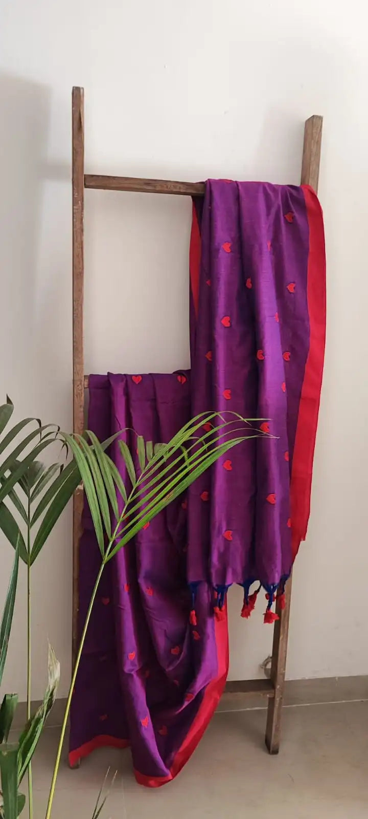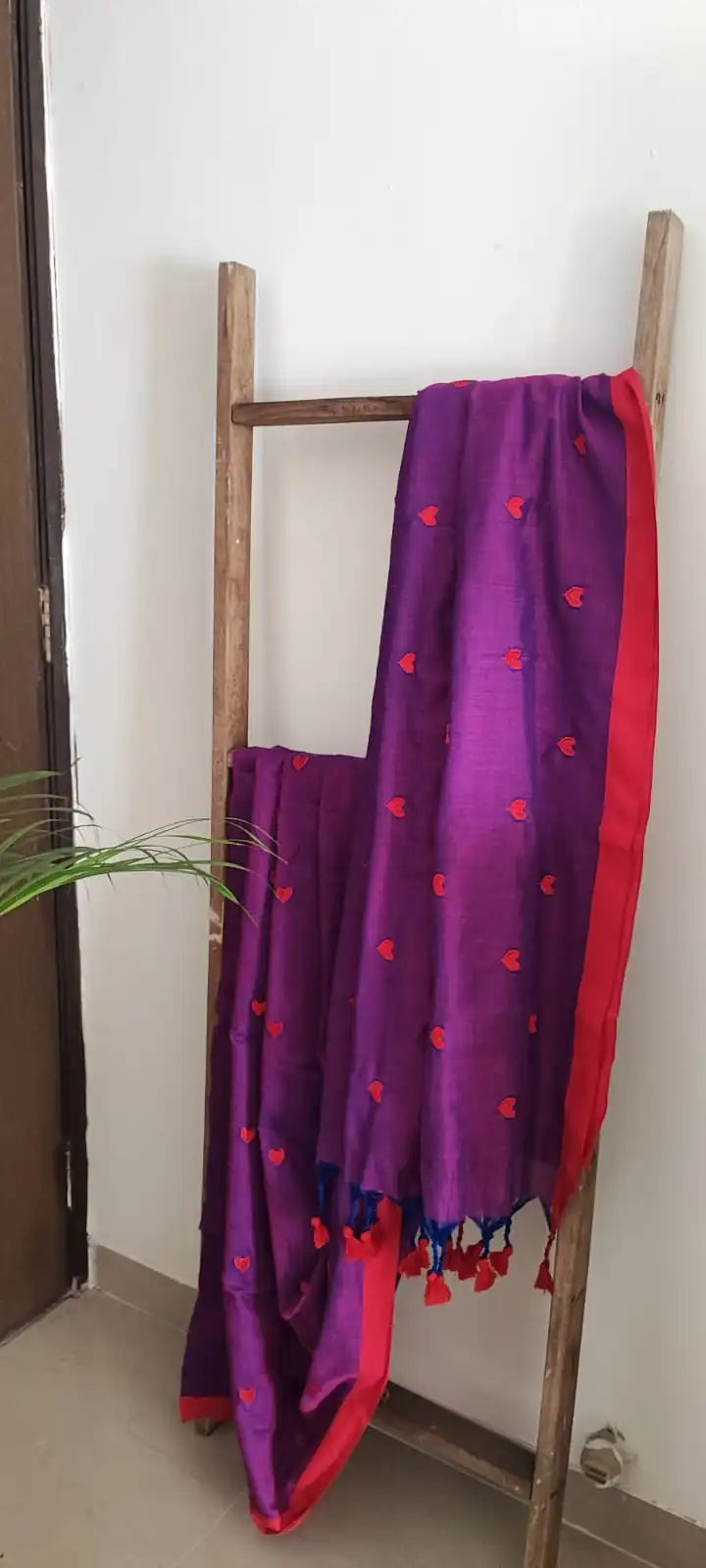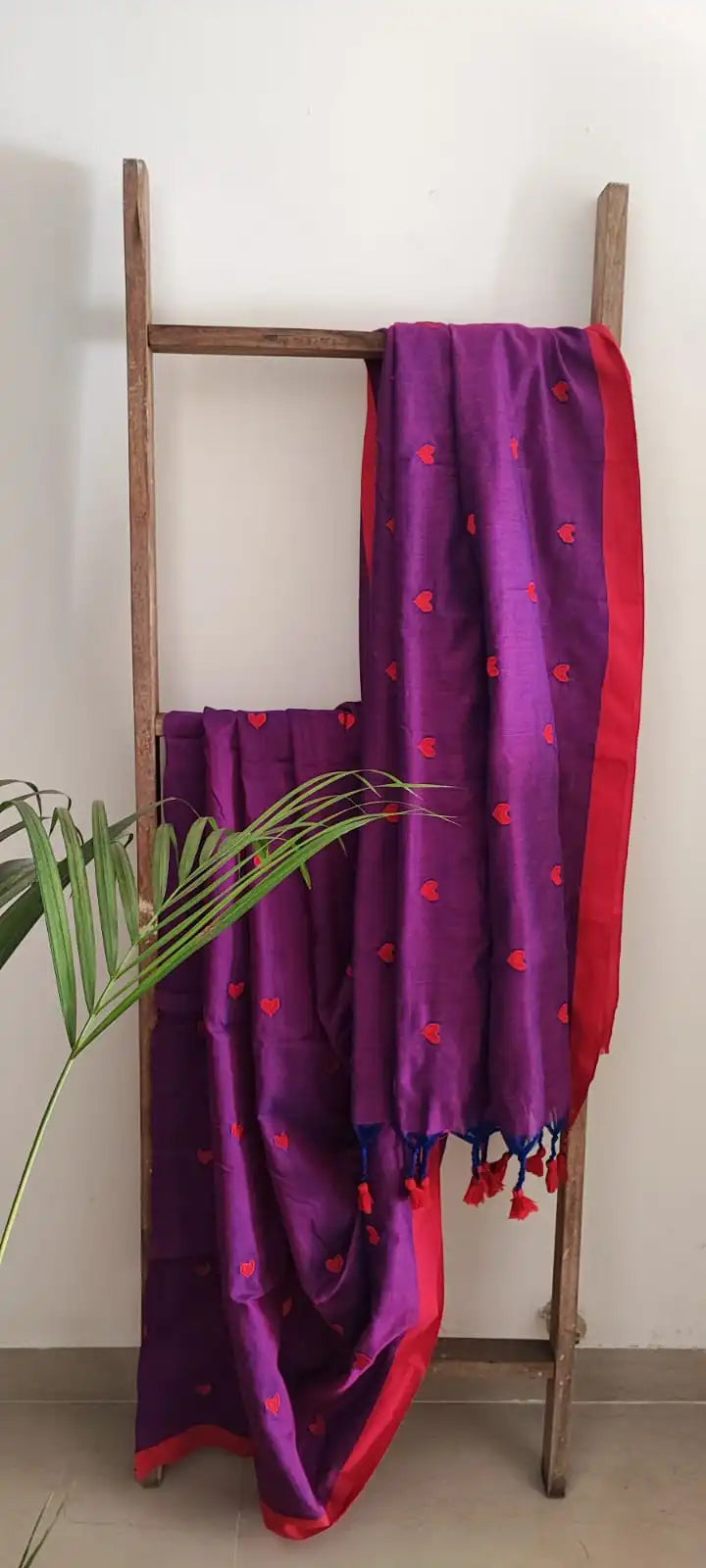 Pure cotton construction and Heart embroidery motifs give this sari an elegant and unique look, perfectly finished with tassels. The perfect addition to any wardrobe!