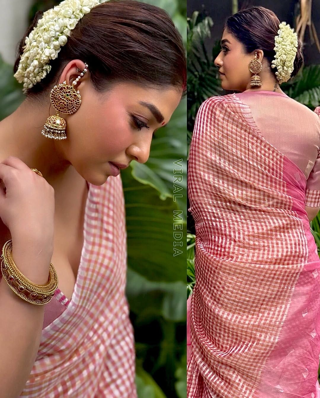 The saree combines traditional craftsmanship with contemporary style, offering a refined and sophisticated look.