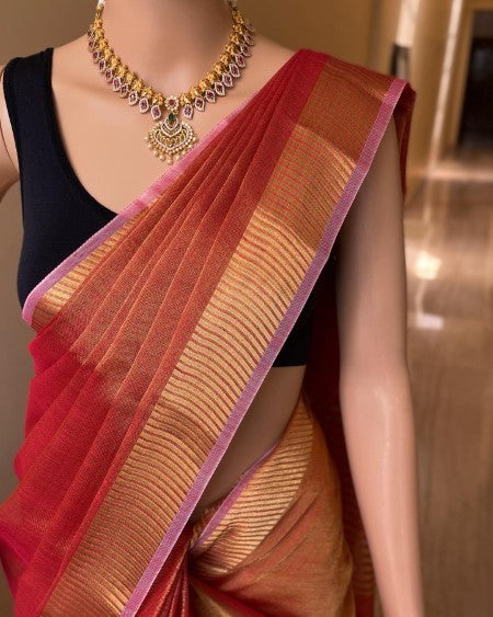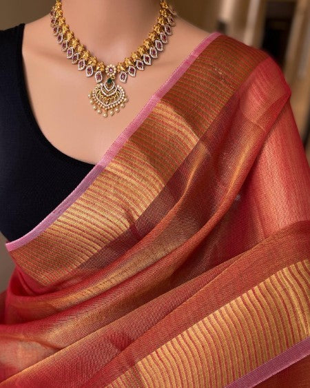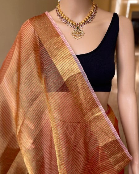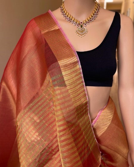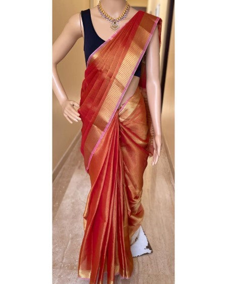Note: A tissue saree is one of the most gossamer forms of saree and is known for its sheen, richness, and luxurious feel. This lustrous fabric is perfect for formal and casual occasions and is the easiest way to achieve a classy look.