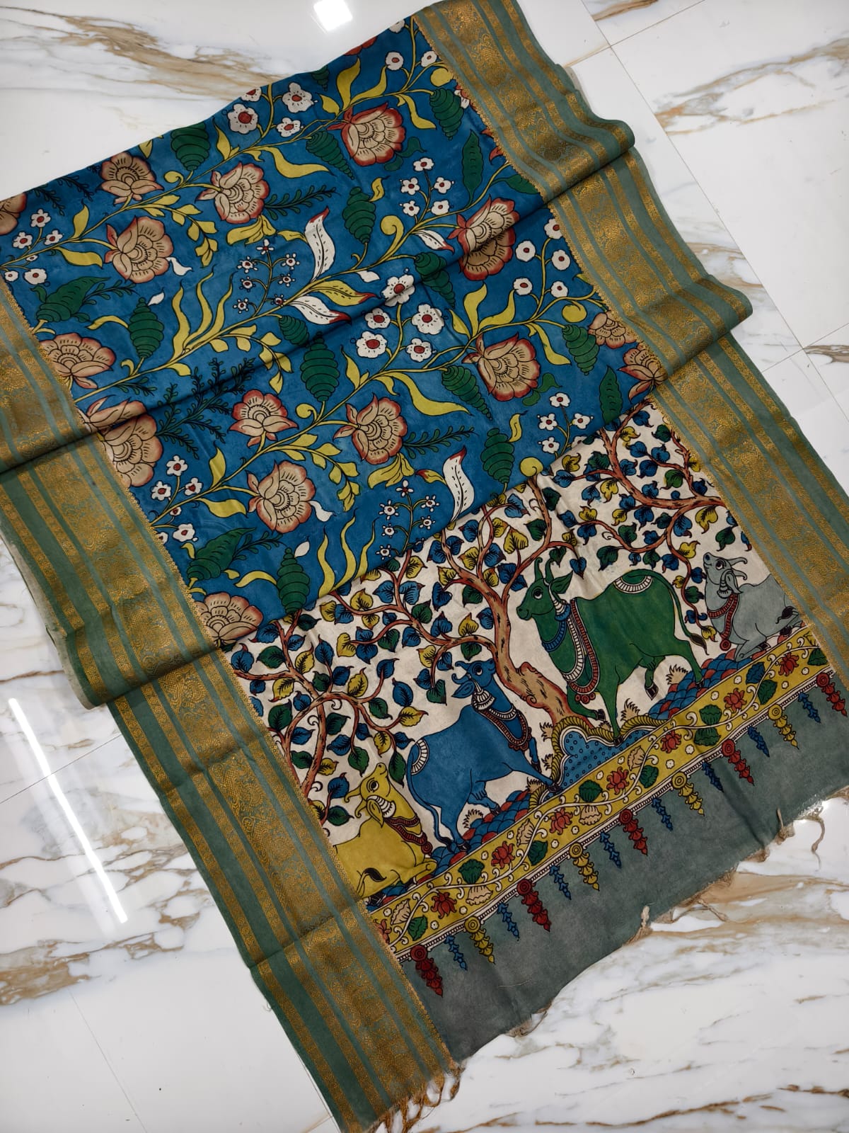 Our collection includes Kalamkari sarees in various materials such as cotton, silk, Tussar, Bangalore silk, and pure Kancheepuram silk. The designs often depict themes like the Tree of Life, mythological scenes, floral patterns, and representations of birds and animals. As these sarees are handmade by skilled artisans, some imperfections and stains may be present, adding to their unique beauty.