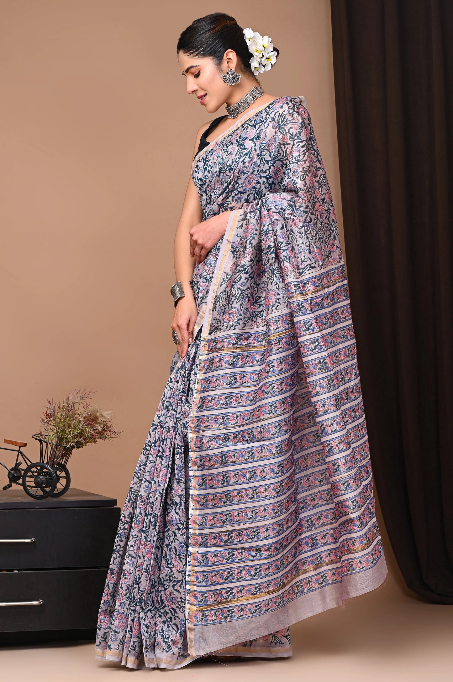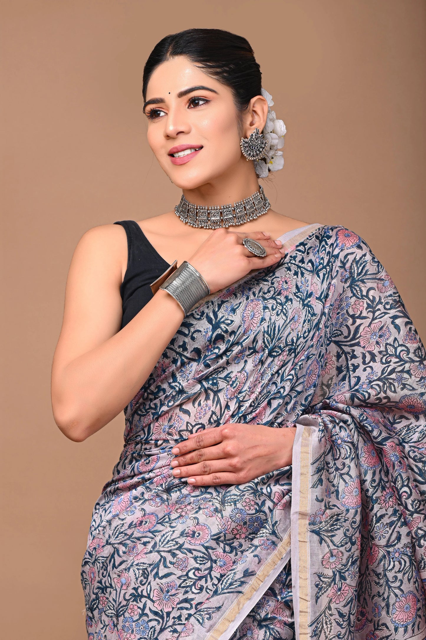 Note - Fine quality Chanderi silk block printed saree with zari border. Chanderi silks are known for its gossamer looks and amazing feel.