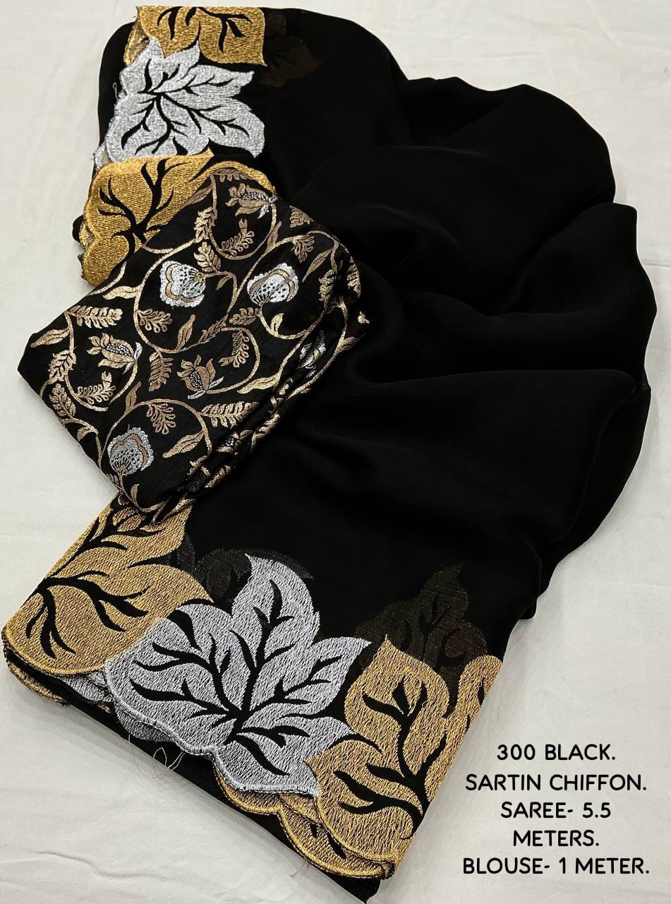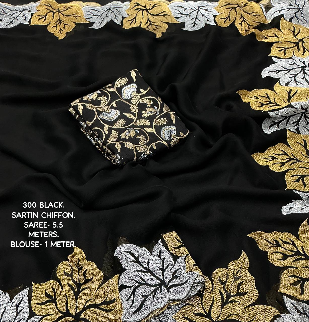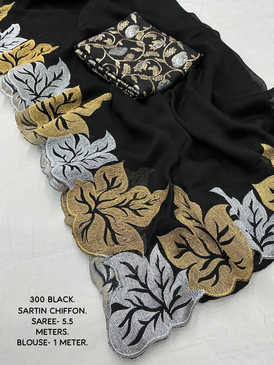soft sartin chiffon saree with leaf design embroidery with cutwork.
