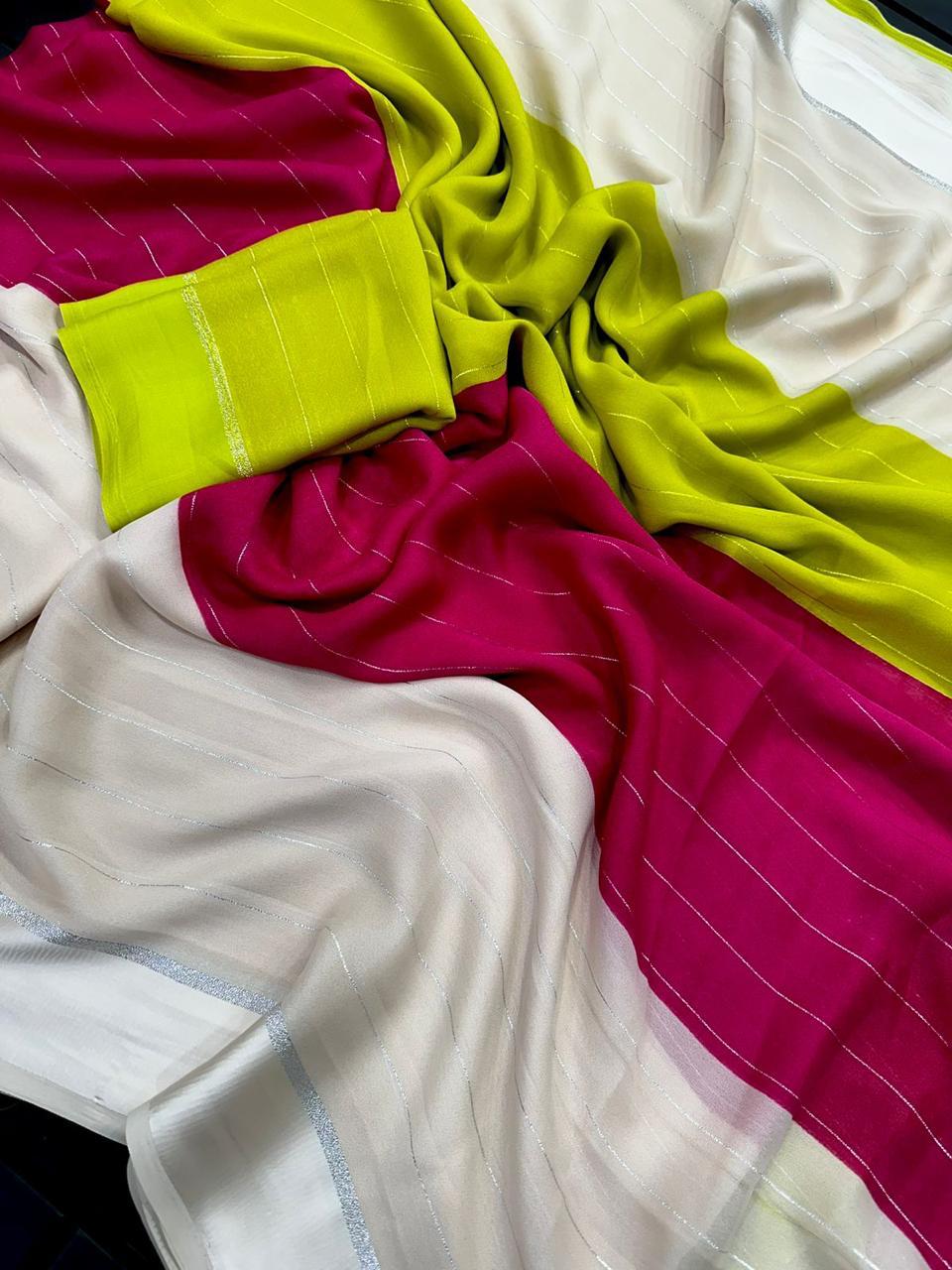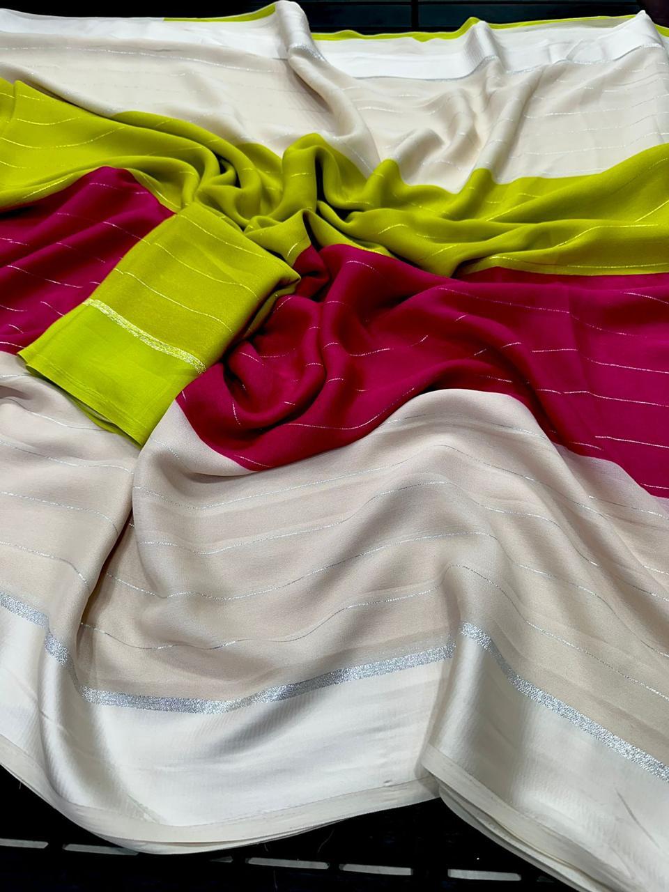 Note: The soft georgette fabric lends a graceful drape and comfortable feel, allowing you to move with ease and confidence. The saree features a mesmerizing soft Worli printed design, beautifully enhanced by cutwork style patched borders.