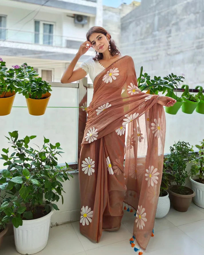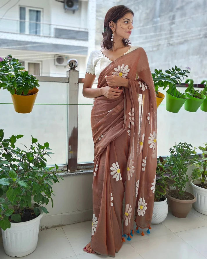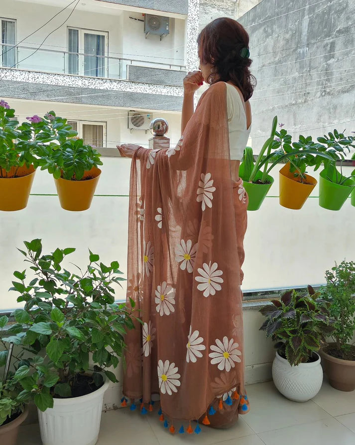 Pure cotton construction and hand-painted flower motifs give this sari an elegant and unique look, perfectly finished with tussels. The perfect addition to any wardrobe!
